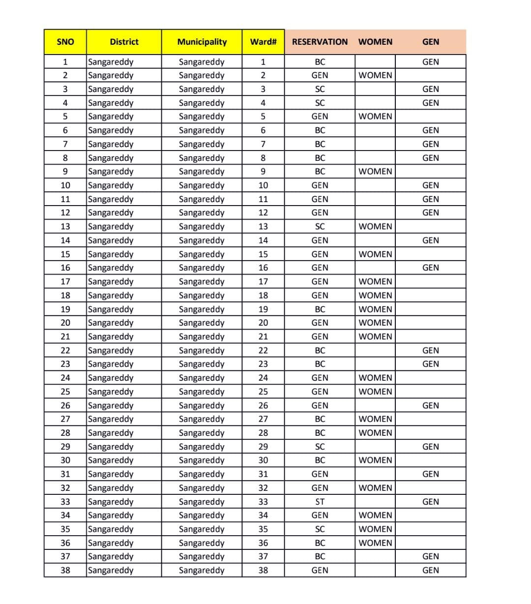 సంగారెడ్డి మున్సిపాలిటీకి సంబంధించి వార్డుల వారీగా కేటాయించిన రిజర్వేషన్ల వివరాలు విడుదల చేశారు.